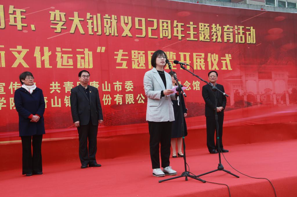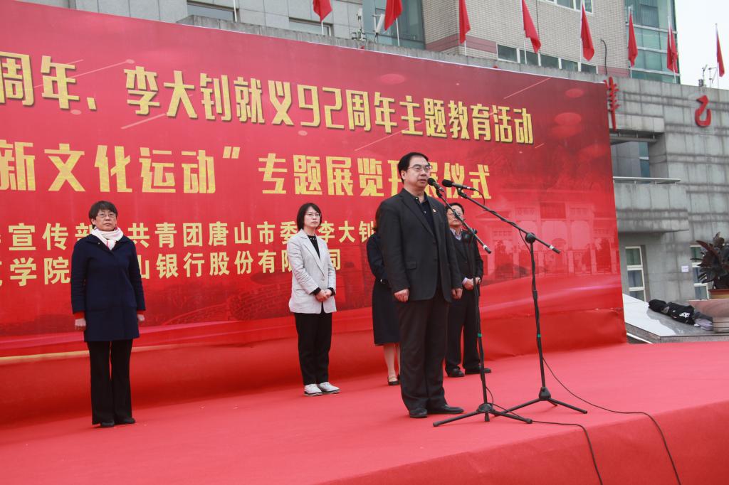 4月28日上午,唐山市纪念五四运动100周年、李大钊就义92周年主题教育活动暨“李大钊与五四新文化运动”专题展览在德赢官网主楼前广场成功举办。团市委书记李虹、市委宣传部宣传处处长李晓兰、市侨联副主席朱秋华、唐山银行副行长安建平、大钊纪念馆副馆长于海英和校党委书记王英、副书记赵剑锋出席开展仪式,同时参加本次活动的还有德赢官网师生代表共计1000余人。开展仪式由团委书记刘继祥主持。