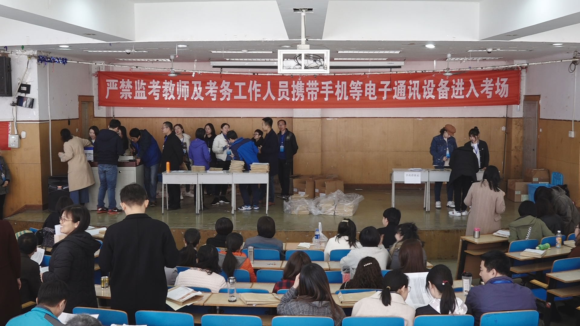 招生就业处从本学期开学初就开始积极筹备,周密把控考点工作的各个环节。从考务用品的准备到标准化考场的布置,从监考教师的遴选到考务工作人员的培训,从考区周围警示性标语的宣传到考场内外防作弊设施的安放,从保密室监控到试卷跟踪管理,从考试实时指挥到考场偶发事件的综合处置,严把考务规范、安全保密、违纪处理等各环节,保证考试工作有序进行。办公室、学生处、财务处、教务处、后勤规划处、安全工作处、团委、现代教育技术中心等相关职能处室通力协作,全方位做好本次考试的各项保障工作。各教学单位精心选派政治素质高、业务素质强的教师参加考务和监考工作,并专门召开各单位监考教师工作动员会,确保考务工作万无一失。教育学院孙尚斌书记、数信系宗鹏主任等院系领导带头参加监考工作。