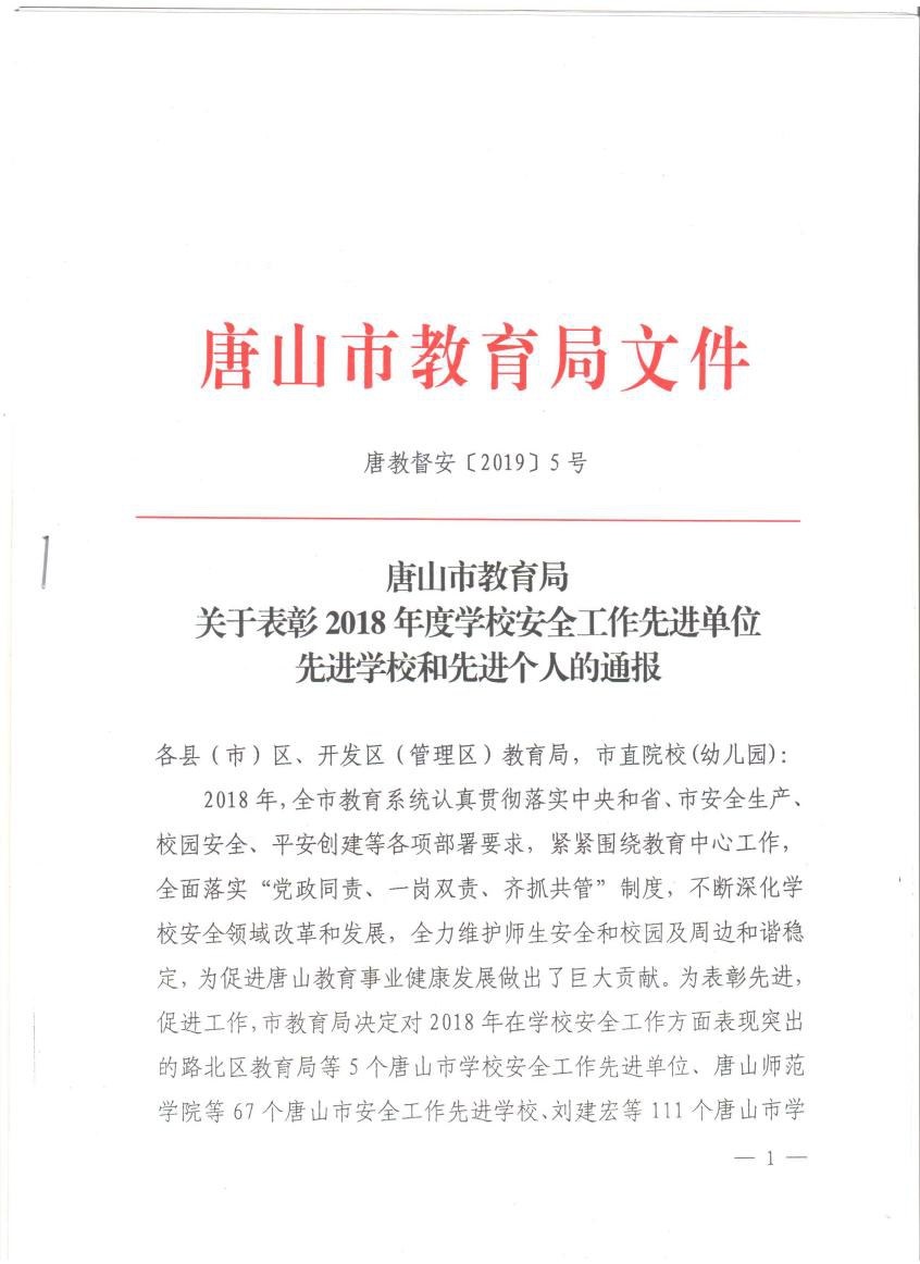 在2019年3月7日召开的唐山市教育局2019年全市学校安全稳定工作会议上,德赢官网被评为唐山市2018年度安全工作先进学校。