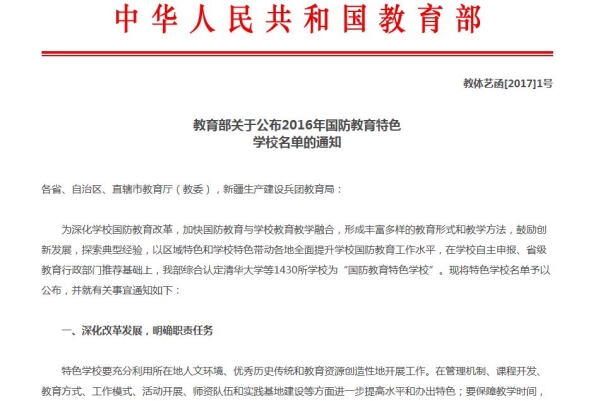 为深化学校国防教育改革,加快国防教育与学校教育教学融合,形成丰富多样的教育形式和教学方法,鼓励创新发展,探索典型经验,以区域特色和学校特色带动各地全面提升学校国防教育工作水平,在学校自主申报、省级教育行政部门推荐基础上,教育部综合认定清华大学等32所本科高校和1398所高职、中职、中小学等各类学校为“国防教育特色学校”。