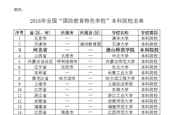 全国“国防教育特色学校”本科院校名单
