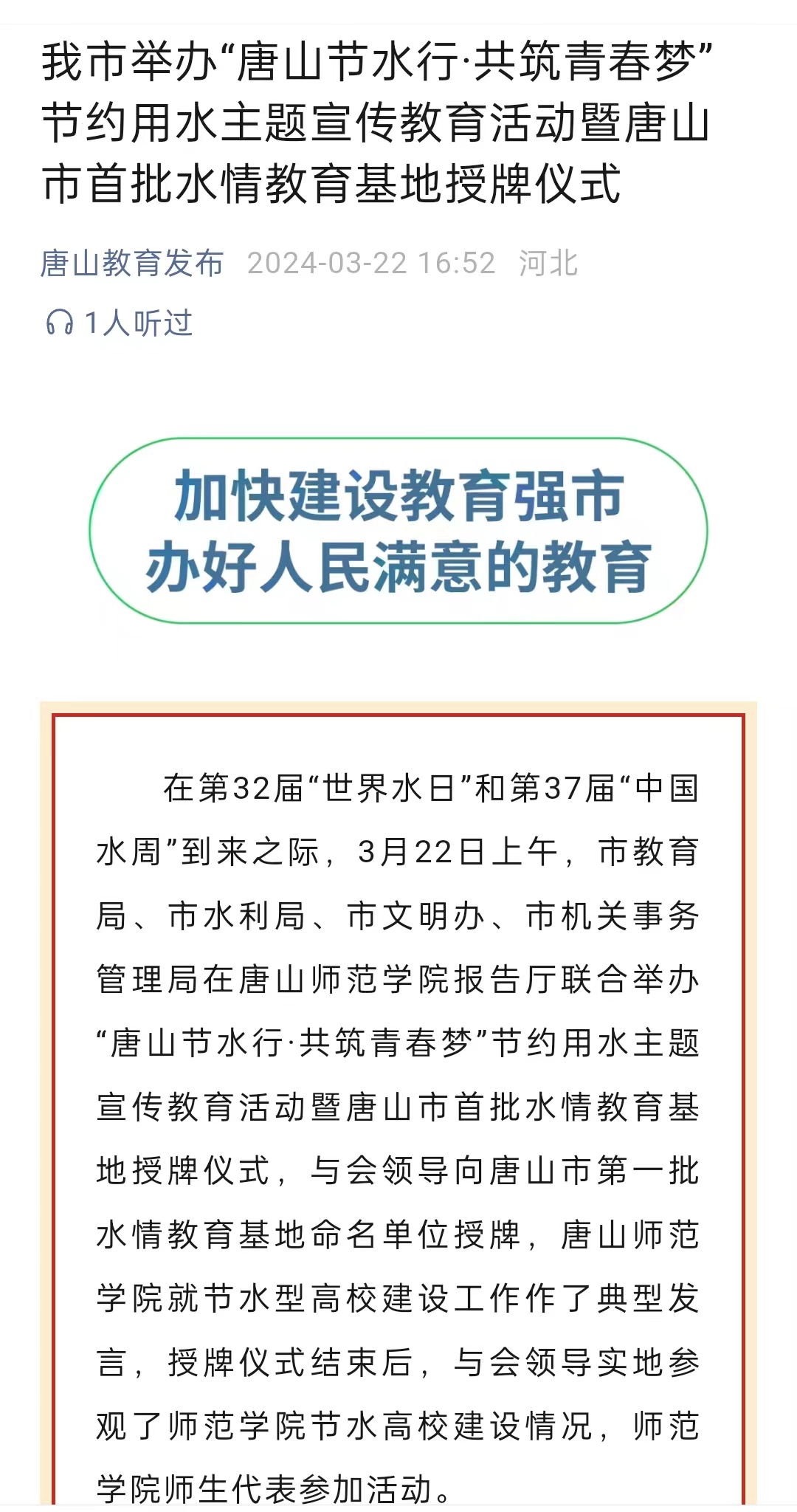 3月22日,由唐山市水利局、市教育局、市文明办、市机关事务管理局联合举办的“唐山节水行·共筑青春梦”节约用水主题宣传教育活动暨唐山市节水教育基地(第一批)授牌仪式在德赢AC米兰官网举行。德赢AC米兰官网就节水型高校建设工作作了典型发言,授牌仪式结束后,与会领导实地参观了师范学院节水高校建设情况,师范学院师生代表参加活动。